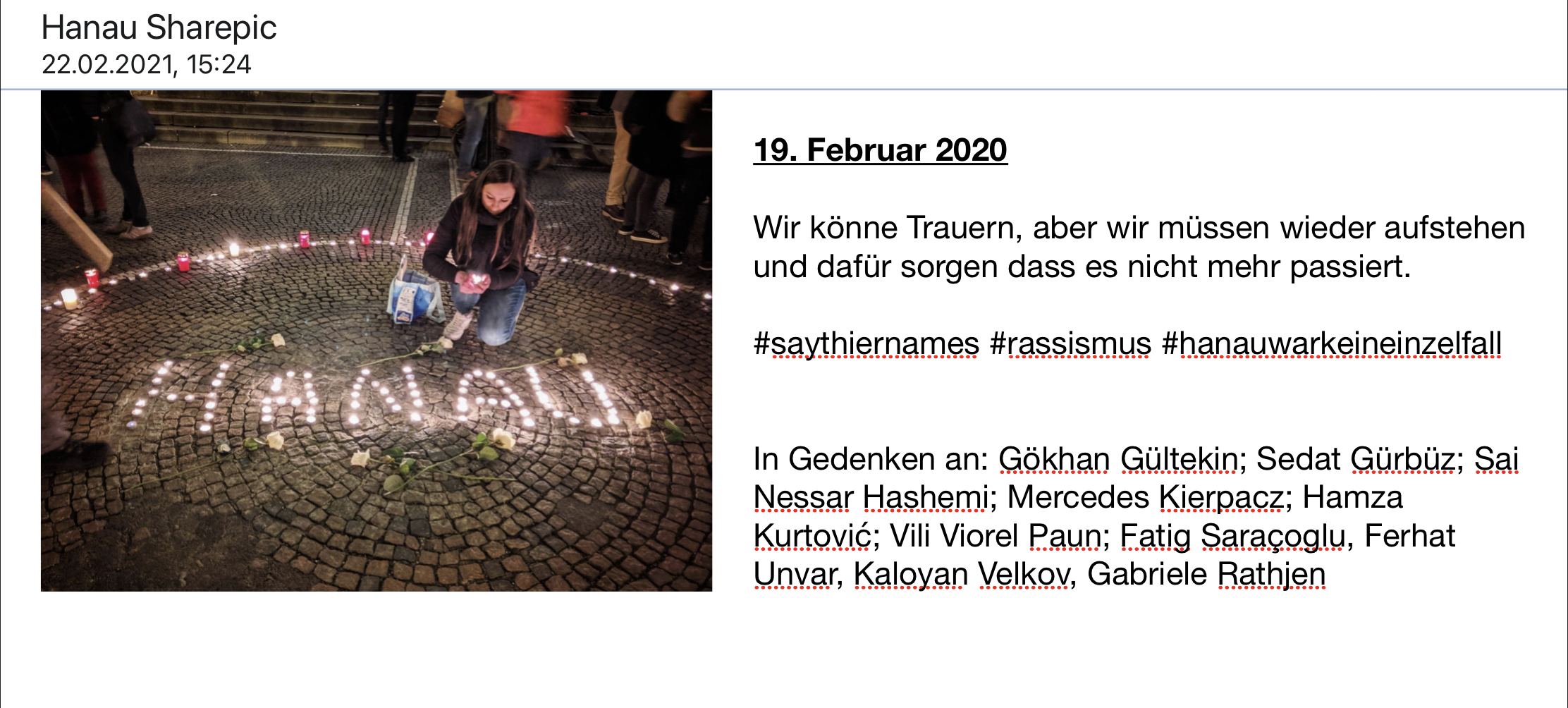 Am 19. Februar 2020 tötet ein Mann neun Menschen in Hanau. Sein Motiv: Rassismus. Seitdem haben die Überlebenden und Angehörigen der Toten viel Presse- und Aufklärungsarbeit geleistet. Doch das sollte nicht nur deren Aufgabe sein. Es ist und bleibt auch Aufgabe der Schulen, die Gründe für diesen und ähnliche Anschläge immer wieder zu thematisieren und aufzuarbeiten, gerade als Schule ohne Rassismus. Im Deutschunterricht setzen die SchülerInnen der W10b sich mit der Tat und den Gründen dafür auseinander, gedachten der Opfer und erstellten selbst ein passendes Sharepic, das so auf Social Media geteilt werden könnte. Die meisten davon nennen vor allem die Namen der Getöteten immer wieder und erinnern die Menschen an das, was vorgefallen ist. Wir kämpfen gemeinsam gegen das Vergessen und wollen nicht, dass sich rassistisch motivierte Anschläge immer wieder wiederholen.